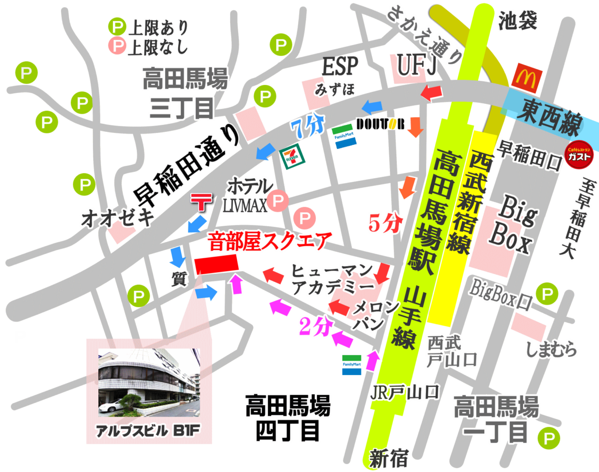 音部屋スクエアは、JR・西武新宿線・東京メトロ東西線が利用できる高田馬場駅から徒歩6分。